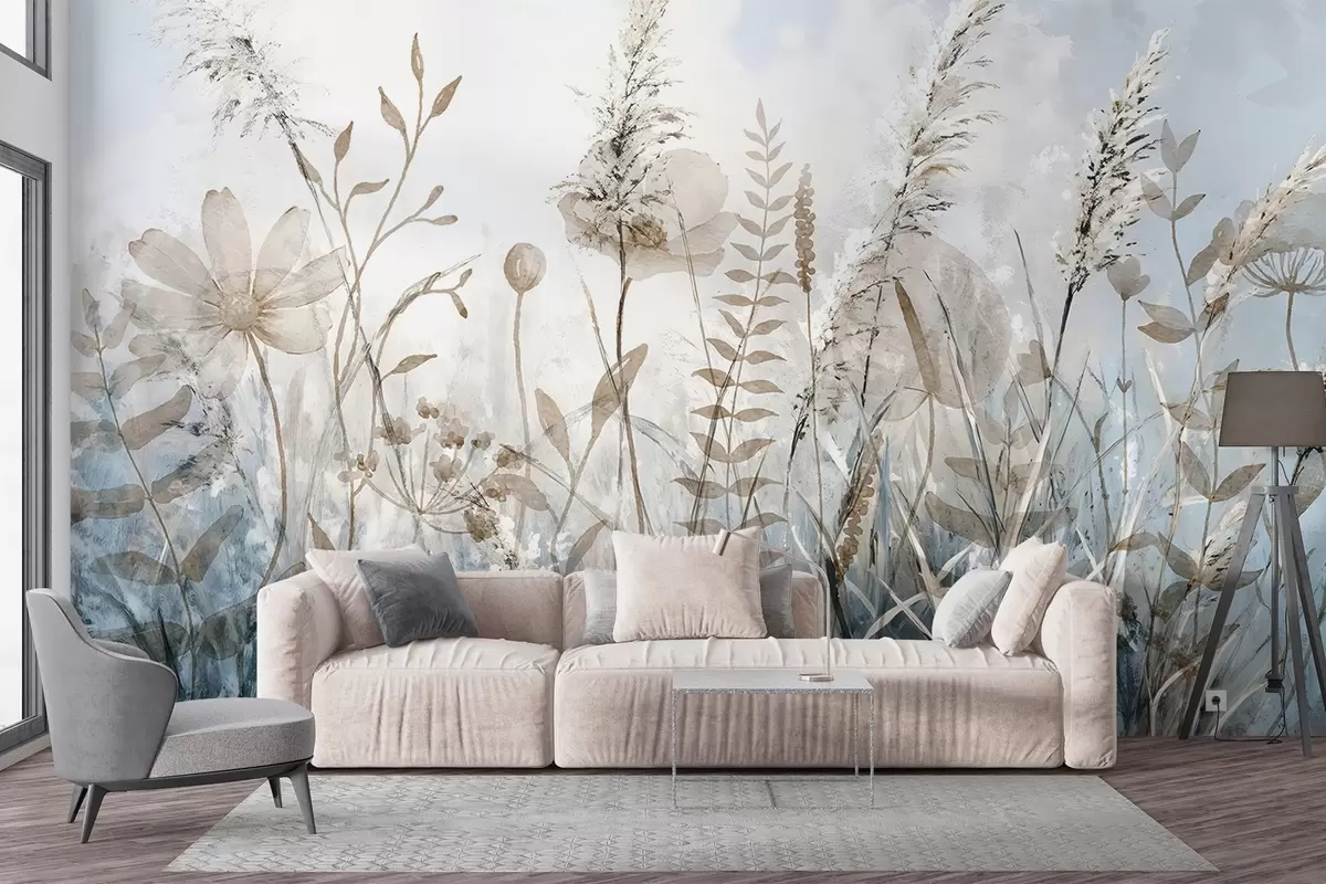 Тапете за зид Поље високе траве, природног лишћа и биљака са меким, танким текстурама наспрам магловитог, облачног неба бр. w08472