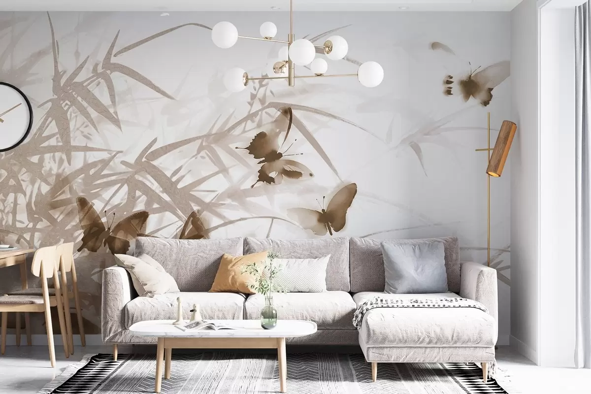 Тапете за зид Текстурни бамбусови листови и стабљике са летећим смеђим лептирима са провидним крилима бр. w08524v1