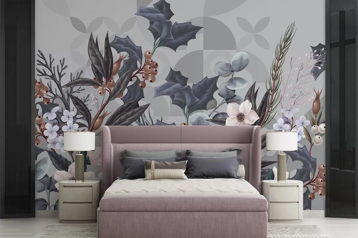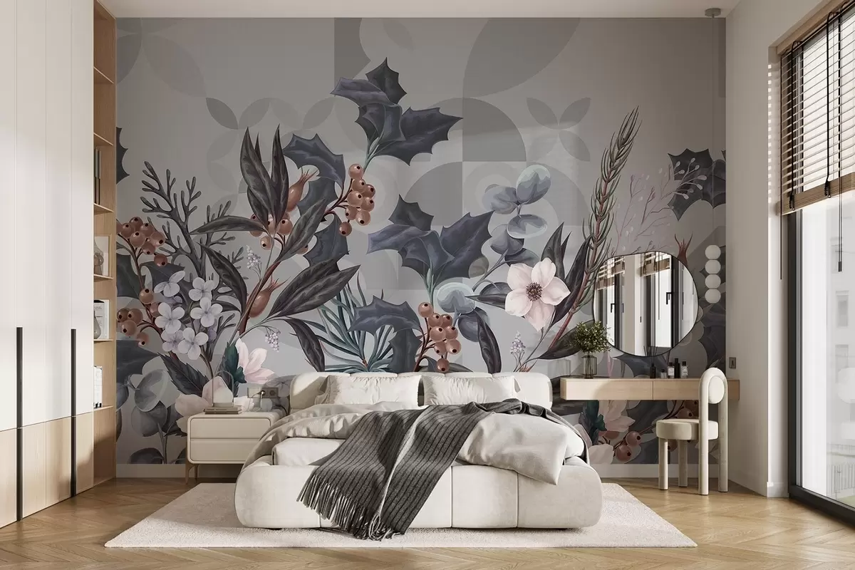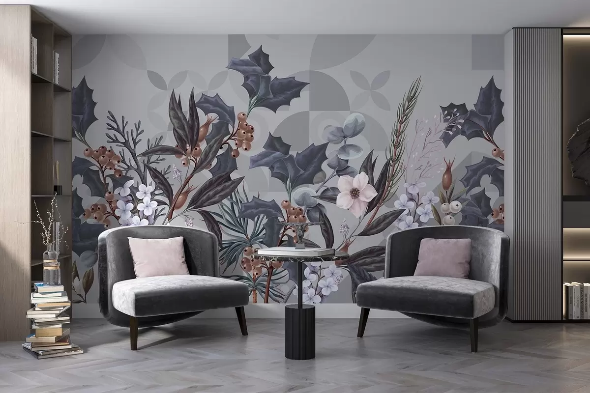 Тапете за зид Цветни аранжман са великим тамним листовима, цвећем и бобицама на пригушеној сивој геометријској апстрактној позадини бр. w08525