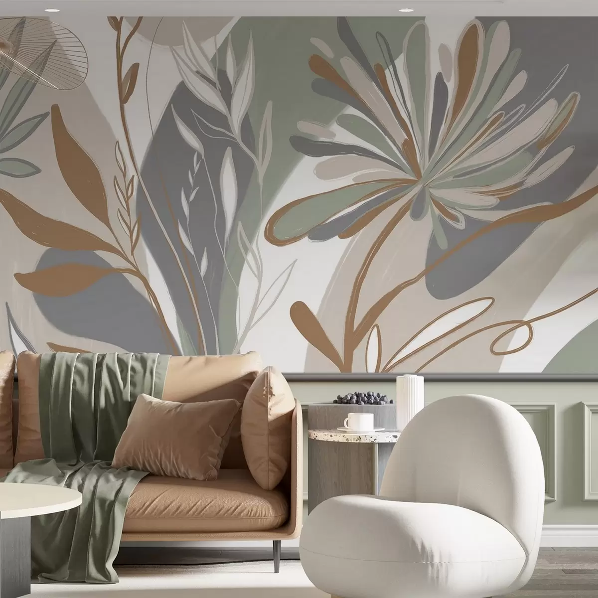 Тапете за зид Апстрактни цветни минималистички принт са стилизованим листовима и латицама у нијансама зелене, сиве и беж бр. w08536