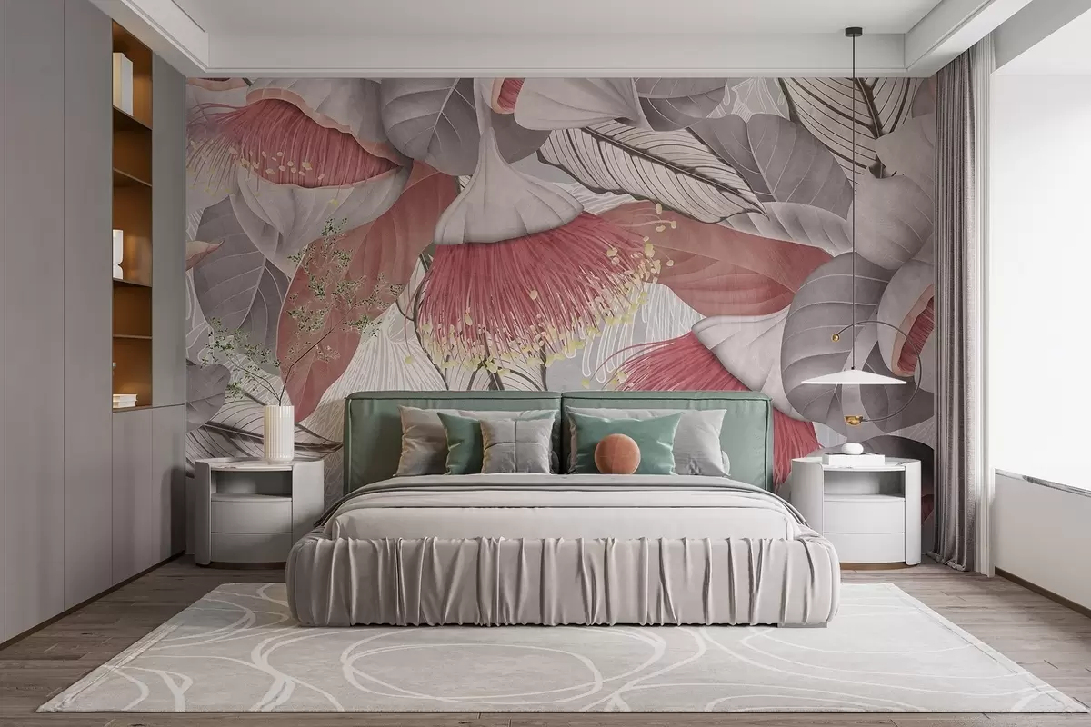Тапете за зид Ботаничка илустрација великих цветова еукалиптуса са дугим прашницима на сивој и белој позадини бр. w08539
