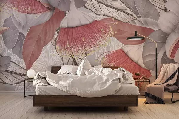 Тапете за зид Ботаничка илустрација великих цветова еукалиптуса са дугим прашницима на сивој и белој позадини бр. w08539