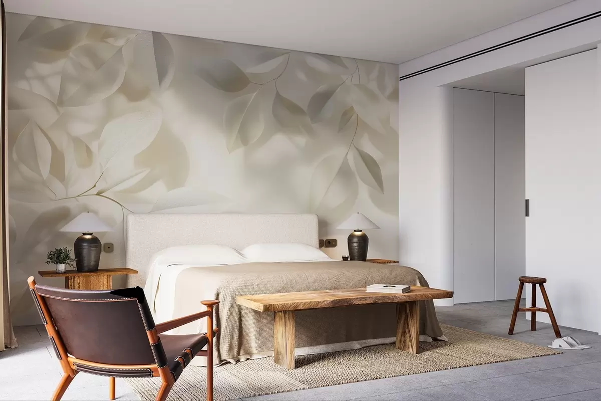 Тапете за зид Висеће беле гране са лишћем уз зид са сунчевом светлошћу бр. w08552