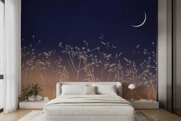 Тапете за зид Маслачак са дивљим цвећем на позадини заласка сунца са плавим небом и месецом бр. w08567