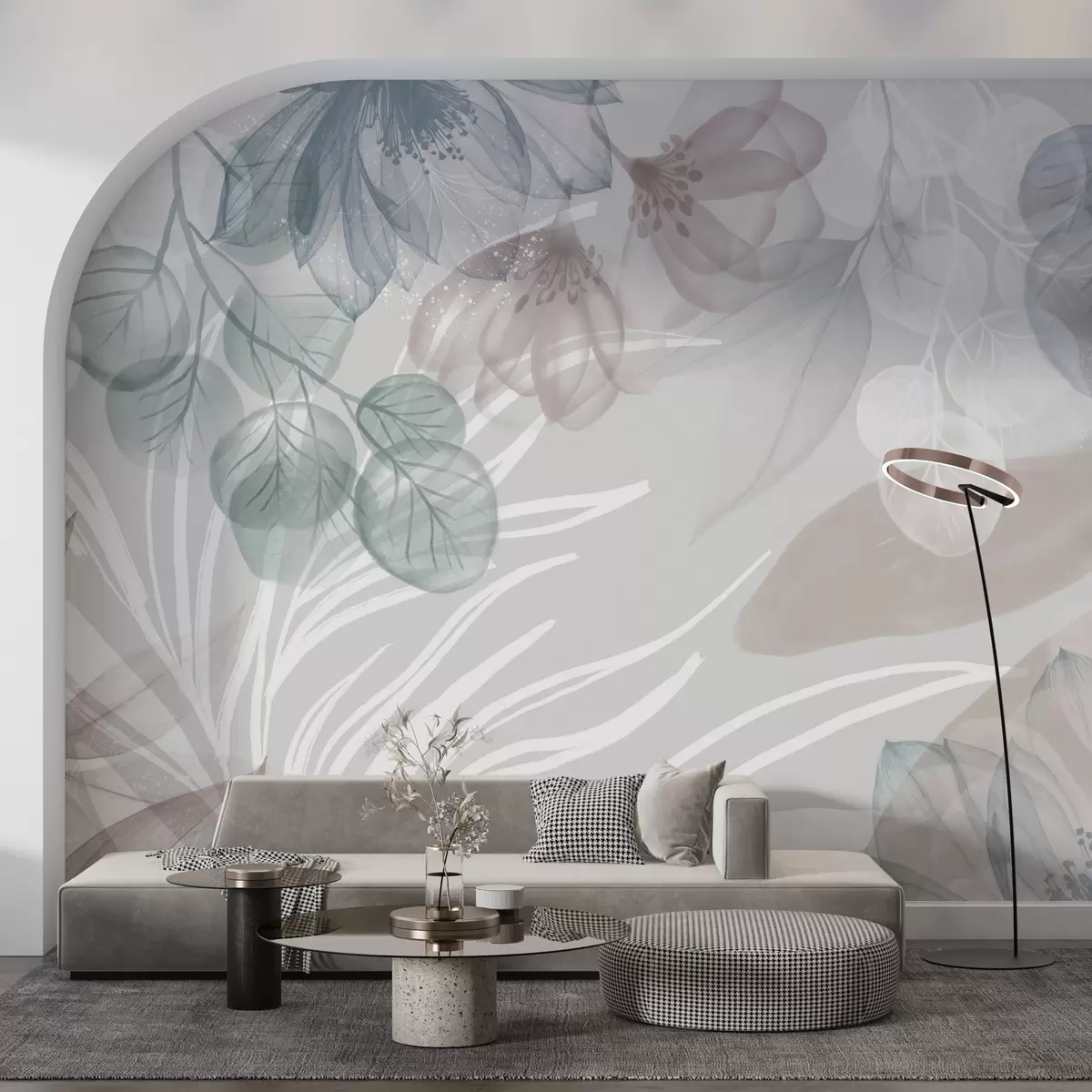 wall murals Цветни принт пастелних боја са провидним великим апстрактним цветовима и листовима у нијансама сиве, розе и зелене w08600