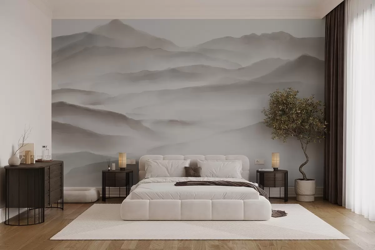 Тапете за зид Минималистички планински пејзаж са валовитим брдима и маглом, стварајући спокојан и атмосферски отисак бр. w08602