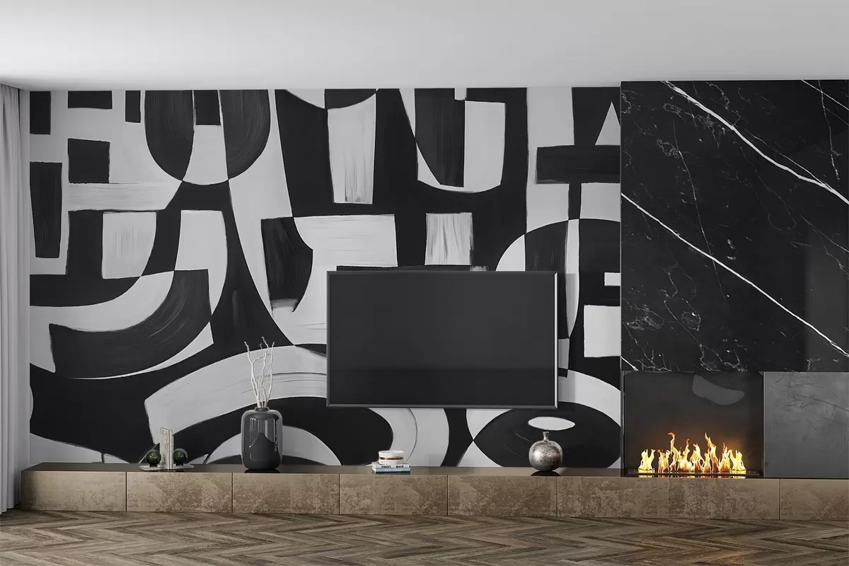 Тапете за зид Апстрактни црно-бели геометријски облици и узорци, стварајући визуелно упечатљиву и динамичну композицију бр. w08608