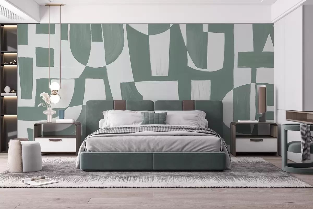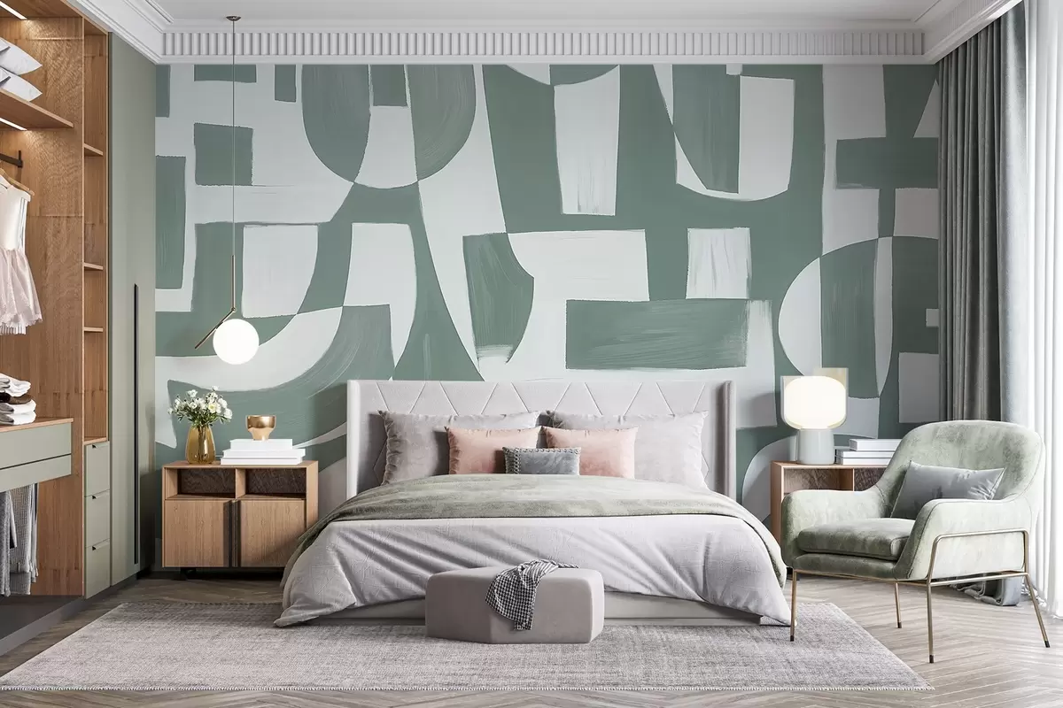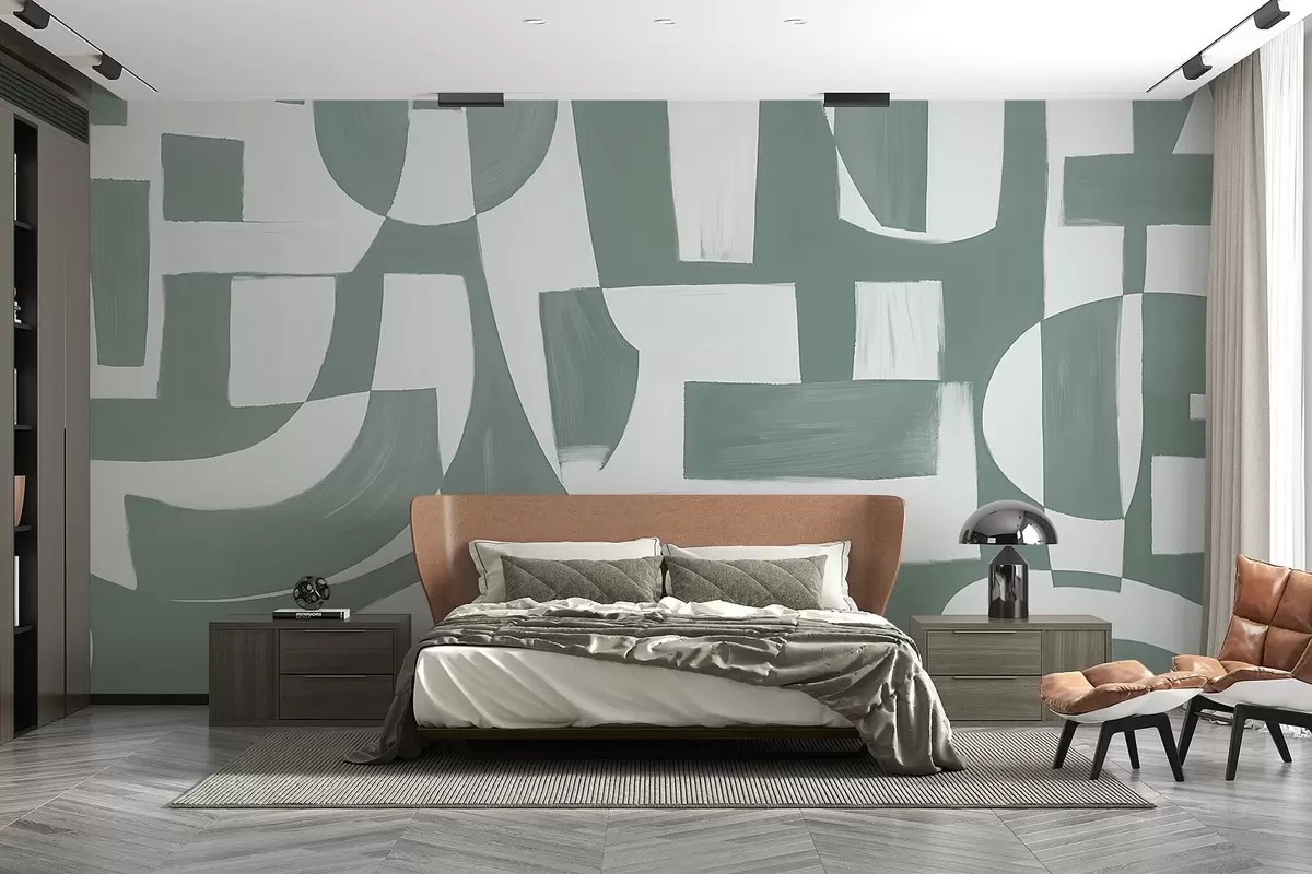Тапете за зид Апстрактни зелени и бели геометријски облици и шаре, стварајући визуелно упечатљиву и динамичну композицију бр. w08608v1
