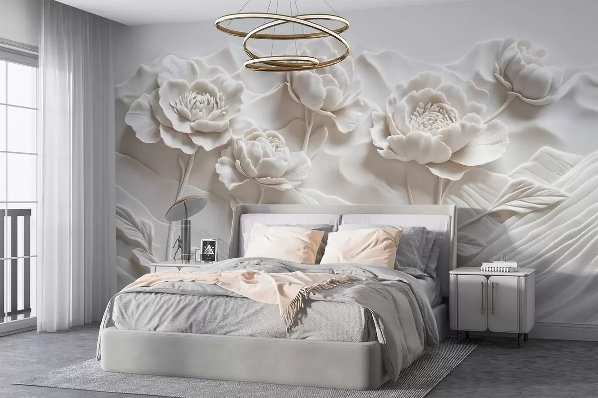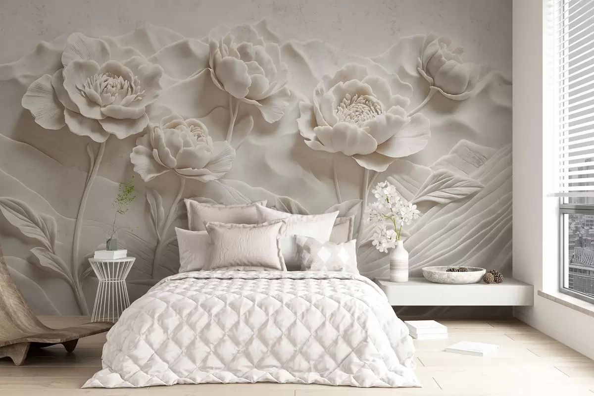 Тапете за зид Бела цветна имитација рељефне скулптуре са великим, детаљним цветовима божура на обичној позадини бр. w08612
