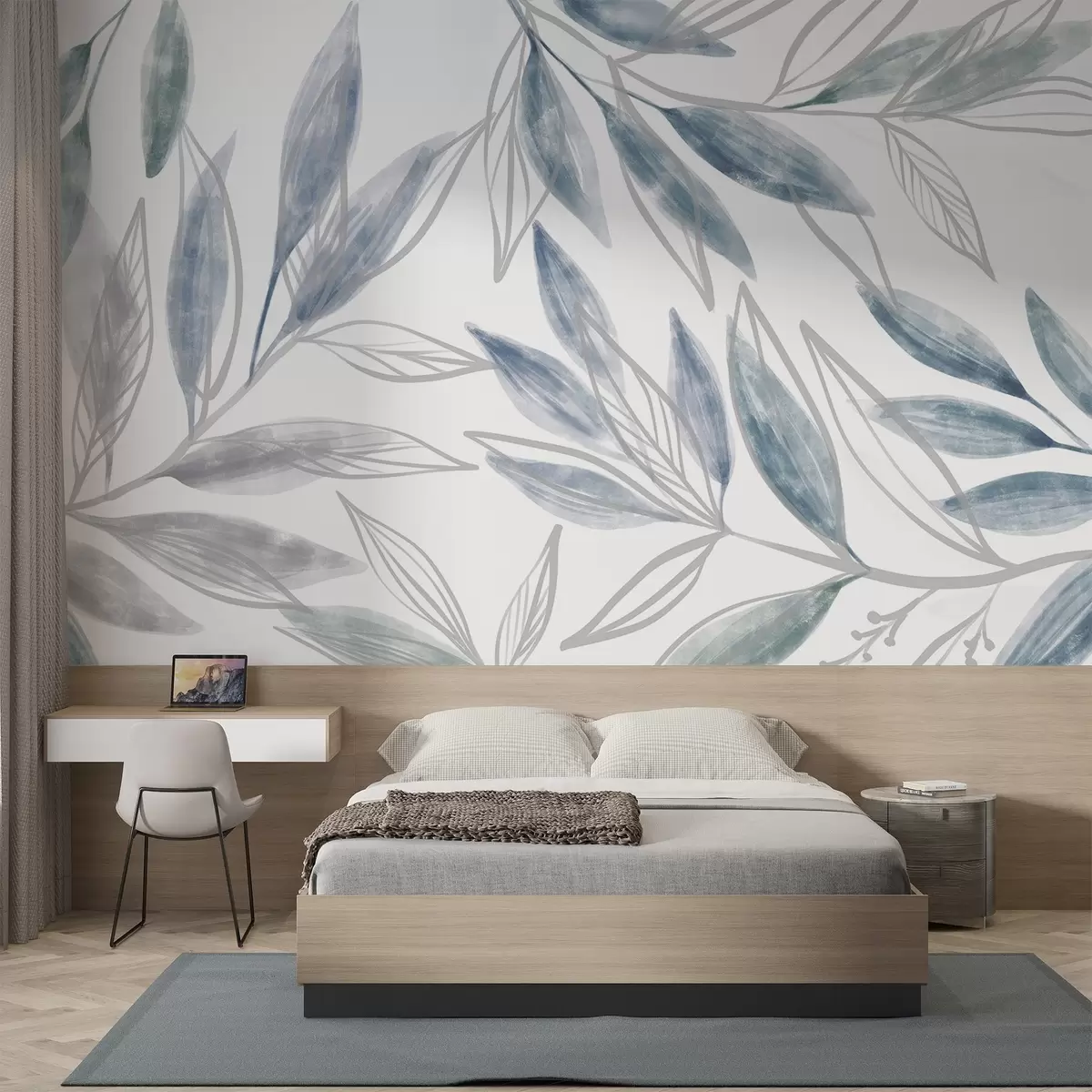 Тапете за зид Деликатне плаве и сиве текстуре пастелних листова, стварајући спокојну и минималистичку ботаничку композицију бр. w08642v1