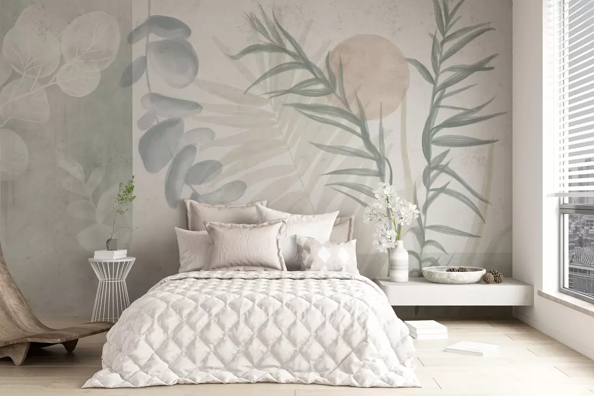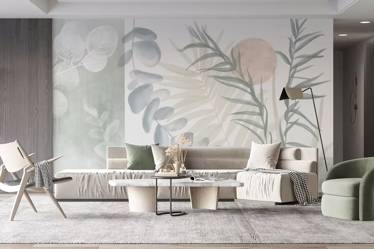 Тапете за зид Минималистички апстрактни принт са стилизованим листовима и еукалиптусом са меким, плавим органским облицима у пригушеним пастелним бојама бр. w08648v1