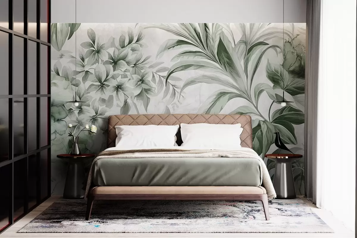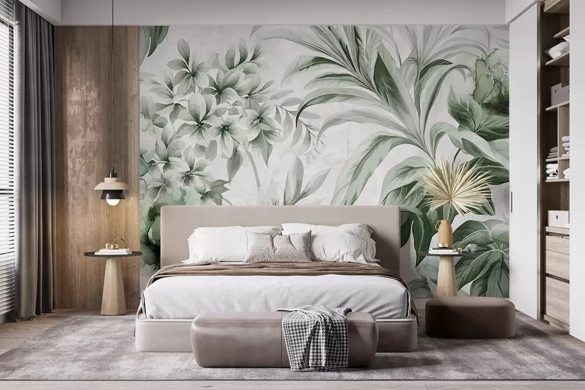 Тапете за зид Тропско лишће и лишће у пригушеној палети у распону од светлих до тамних нијанси зелене на текстурираној светлој позадини бр. w08650