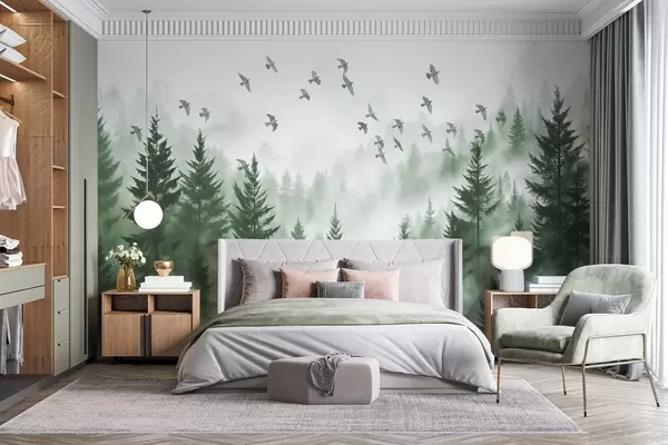 Тапете за зид Мирна магловита шума са дрвећем у нијансама зелене и јатом птица лети на небу бр. w08664v1