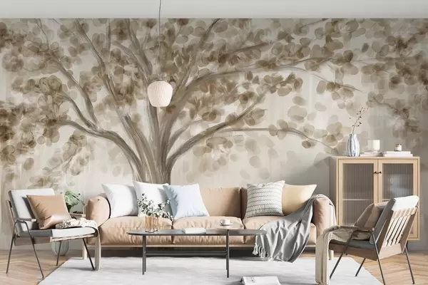 Тапете за зид Велико дрво са меким, апстрактним листовима у беж боји на светлој, неутралној позадини која појачава тонове дрвета бр. w08669