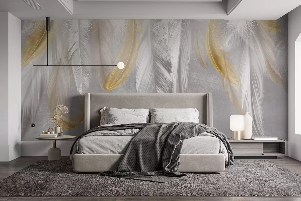 Тапете за зид Бело и жуто перје виси на меко сивој позадини, стварајући деликатну и прозрачну композицију бр. w08670