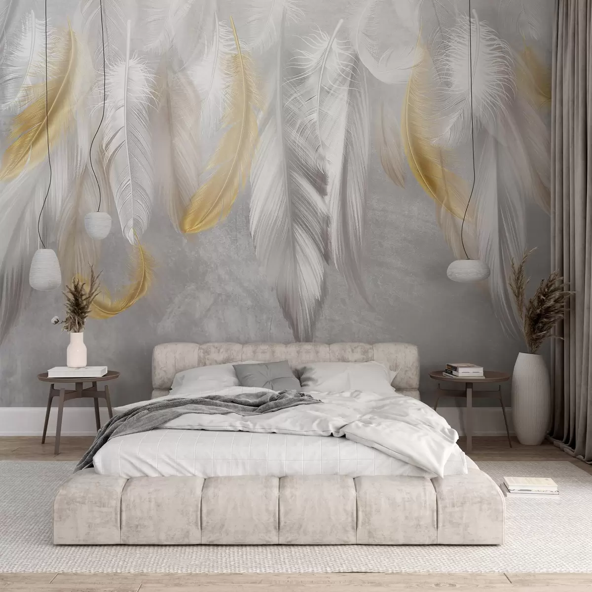 Тапете за зид Бело и жуто перје виси на меко сивој позадини, стварајући деликатну и прозрачну композицију бр. w08670