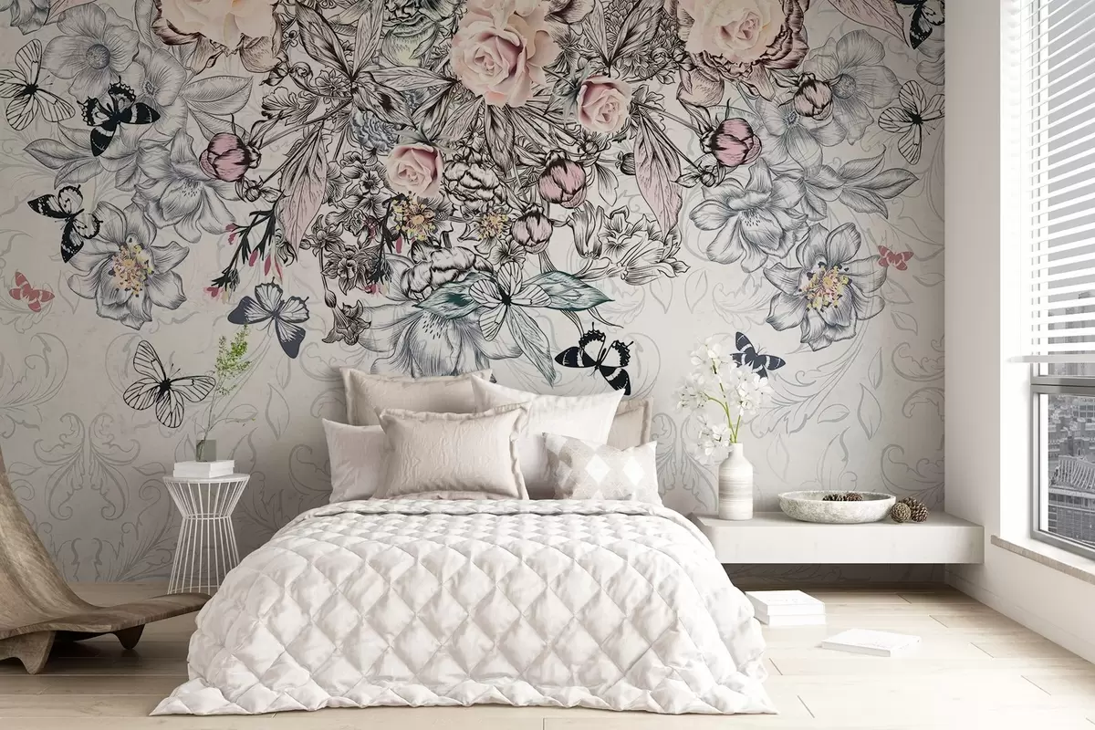 Тапете за зид Цветни цртеж са ружичастим ружама и разним цвећем и лептирима са замршеном линијом на текстурираној позадини бр. w08674
