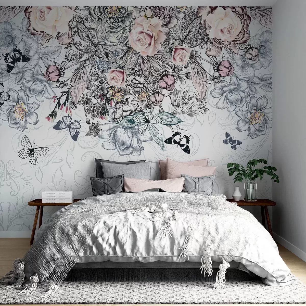 Тапете за зид Цветни цртеж са ружичастим ружама и разним цвећем и лептирима са замршеном линијом на текстурираној позадини бр. w08674