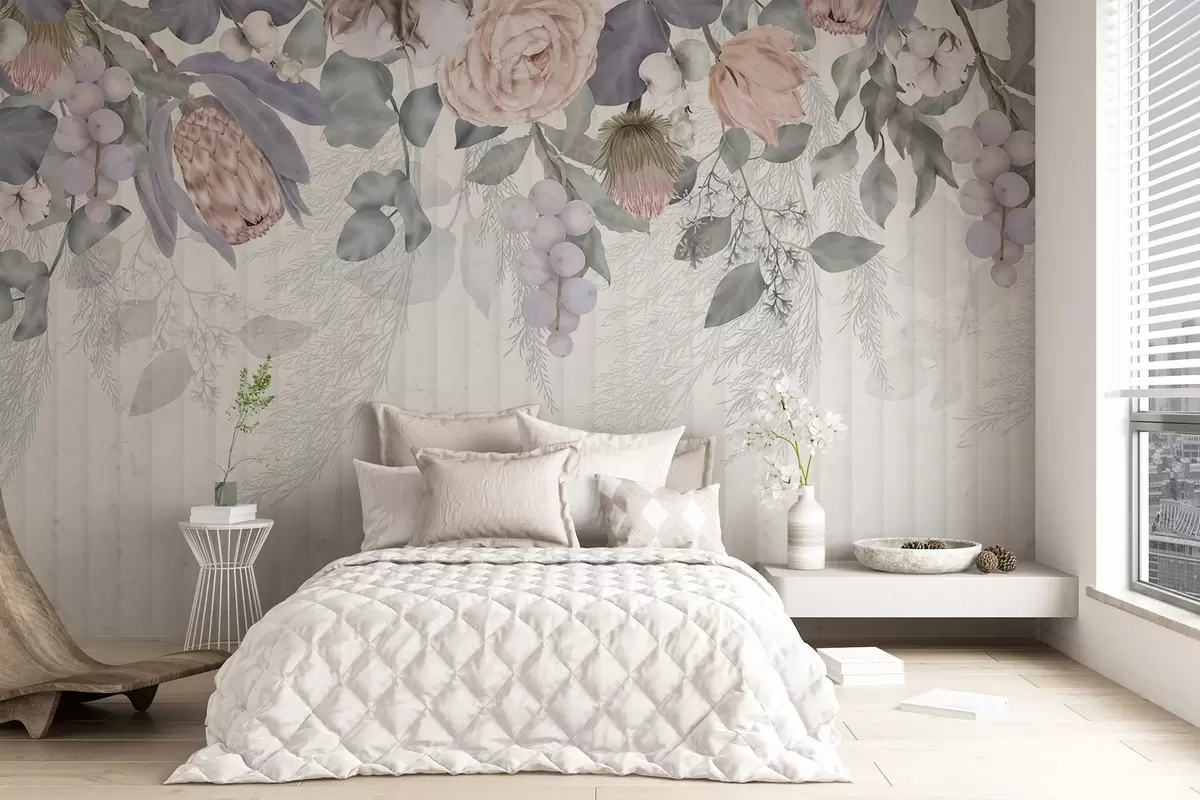 Тапете за зид Цветне пастелне ружичасте руже, цвеће протеа, гране еукалиптуса и бобице на текстурираној позадини бр. w08700