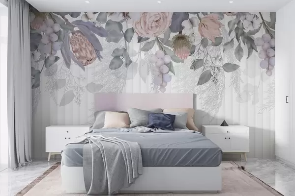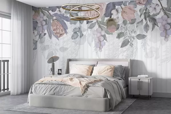 Тапете за зид Цветне пастелне ружичасте руже, цвеће протеа, гране еукалиптуса и бобице на текстурираној позадини бр. w08700