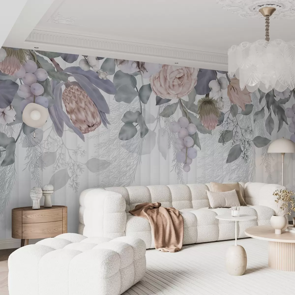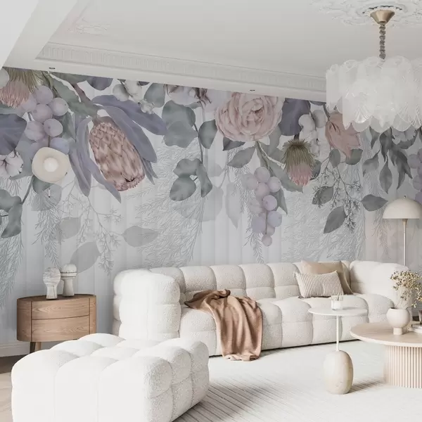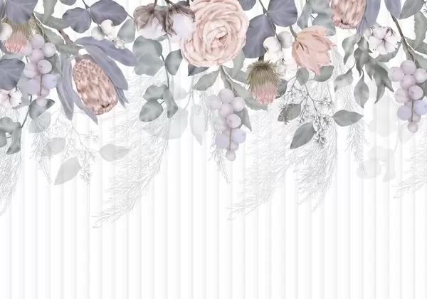 Тапете за зид Цветне пастелне ружичасте руже, цвеће протеа, гране еукалиптуса и бобице на текстурираној позадини бр. w08700