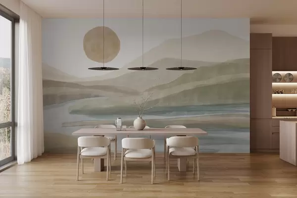 Тапете за зид Пејзаж слојевитих планина са благим нагибом, вијугава река, пригушено наранџасто сунце на небу бр. w08702