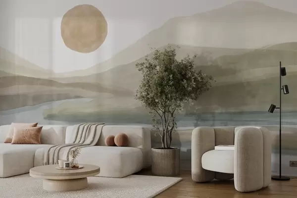 Тапете за зид Пејзаж слојевитих планина са благим нагибом, вијугава река, пригушено наранџасто сунце на небу бр. w08702