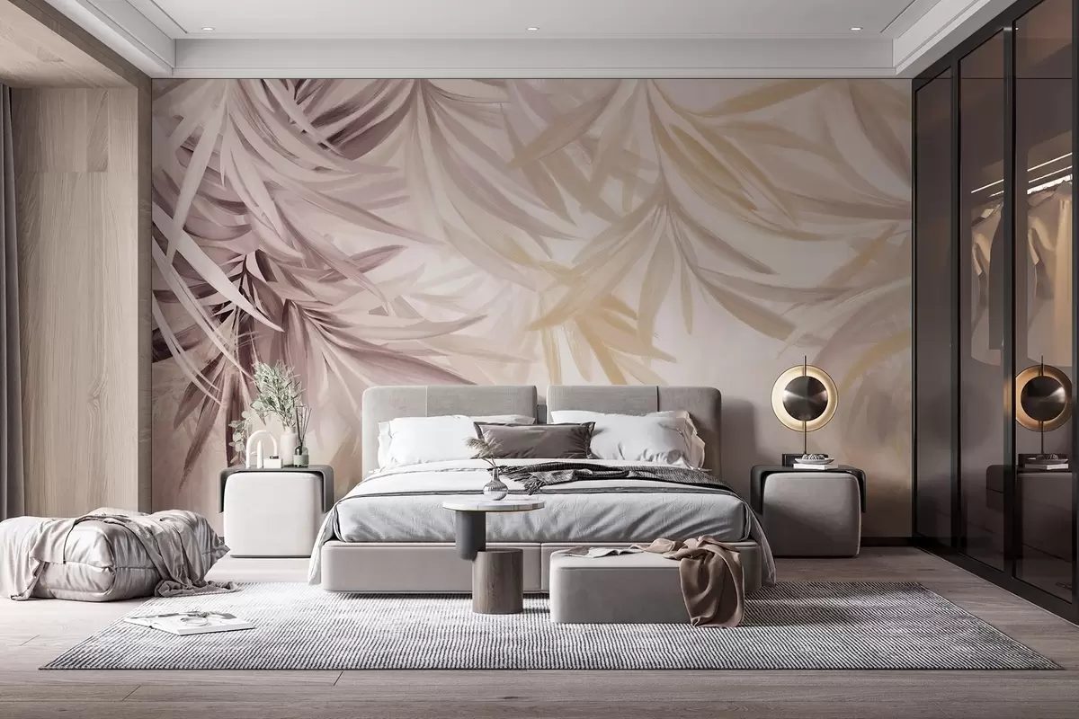 Тапете за зид Меко, тече тропско лишће светле боје у нијансама браон и наранџасте, стапајући се у бледи, неутрални отисак бр. w08703v1