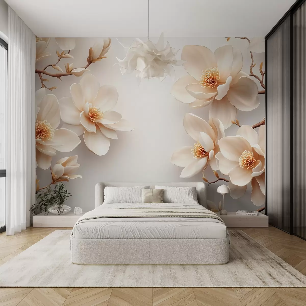 Тапете за зид Прелепи цветови магнолије крем боје на белој позадини бр. w08704