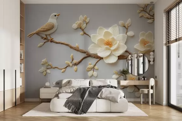 Тапете за зид У стилу везеног цвећа магнолије са птицом на грани на светло плавој позадини бр. w08724