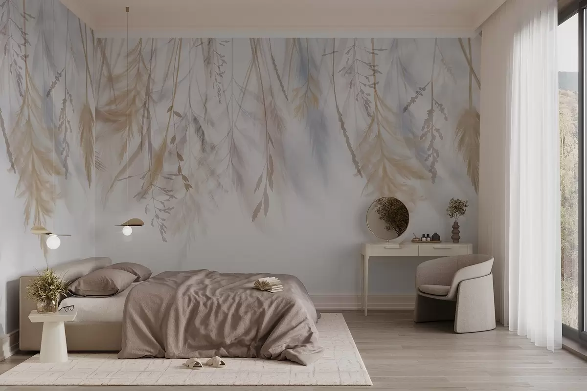Тапете за зид Нежне траве, класови и биљке у пастелним тоновима, распоређени у каскадни принт на бледој позадини бр. w08737