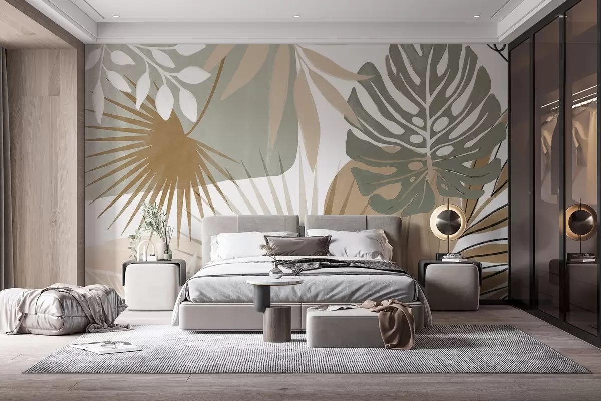 Тапете за зид Апстрактни дизајн са разним тропским листовима и земљаним тоновима зелене, беж и крем бр. w08738v1