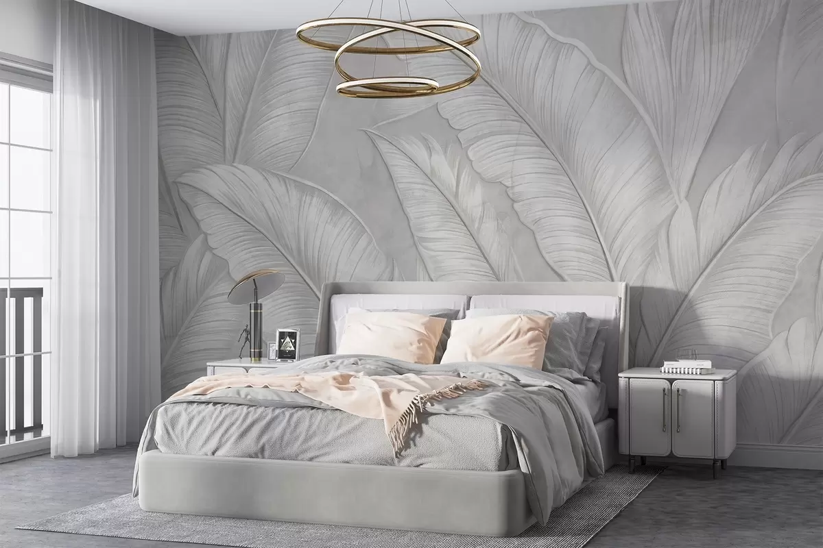 Тапете за зид Велики тропски листови високе текстуре са детаљима у монохроматској светлосивој боји у стилу поткровља бр. w08772