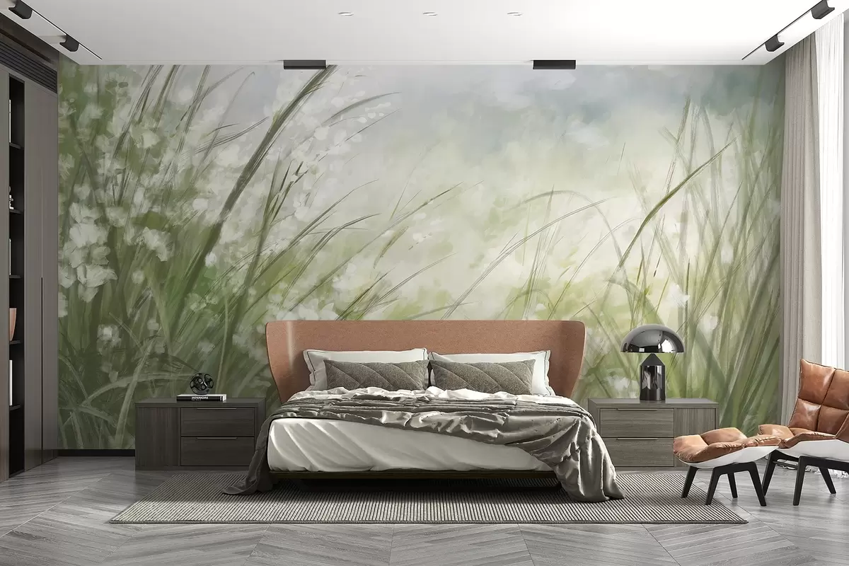 Тапете за зид Бујна зелена трава са деликатним белим цветовима, меко замућен отисак са светлим нијансама, стварајући миран пејзаж бр. w08779
