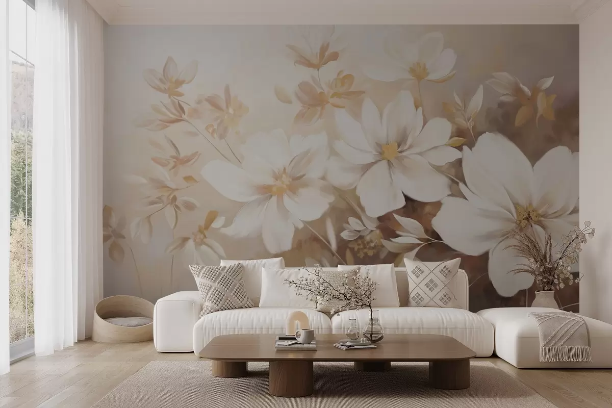 Тапете за зид Бело обојено цвеће са меким латицама и деликатним листовима, на светло беж и крем позадини бр. w08780