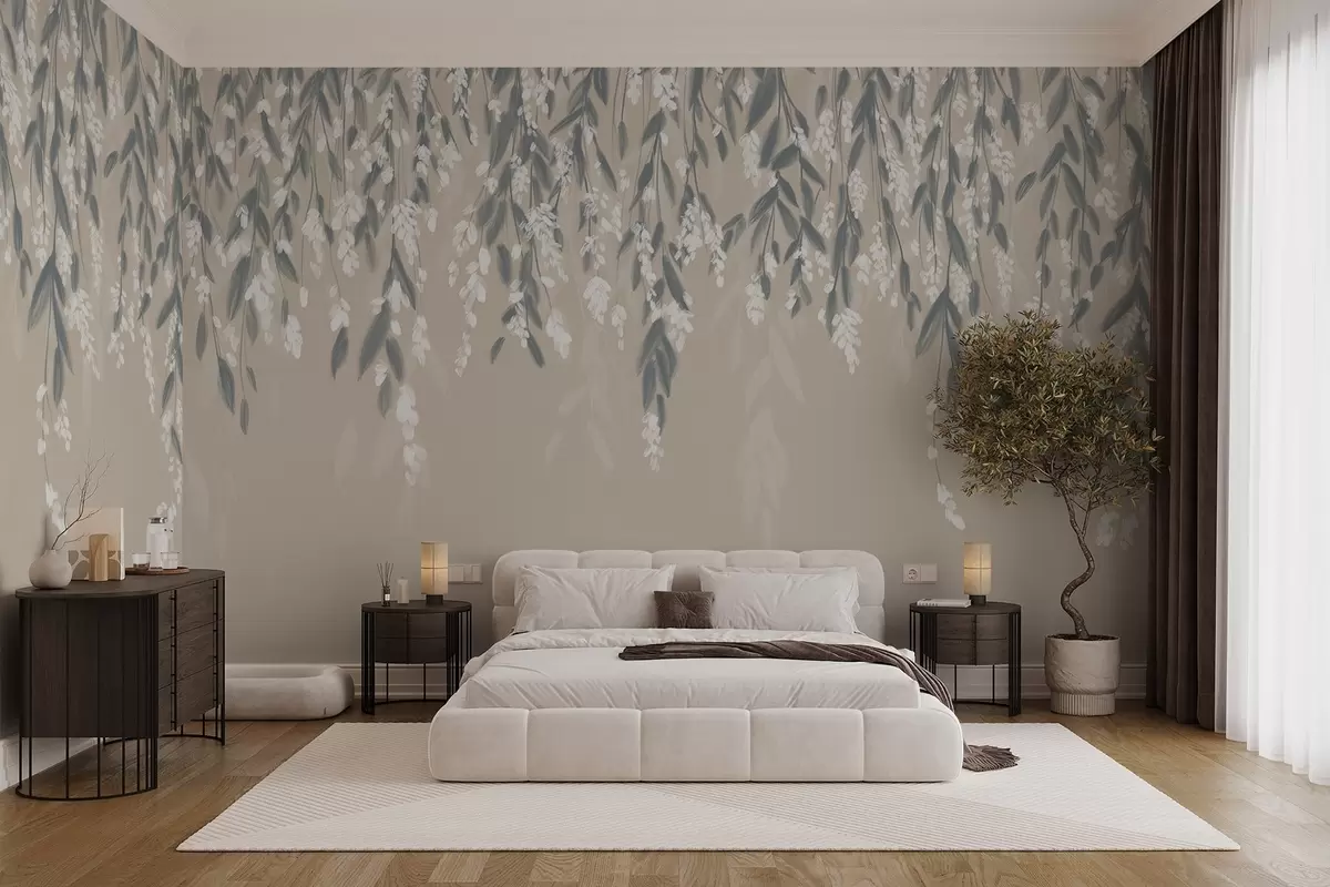Тапете за зид Каскадне гране лишћа у нијансама пригушене зелене са белим цветовима и листовима на беж позадини бр. w08781