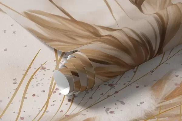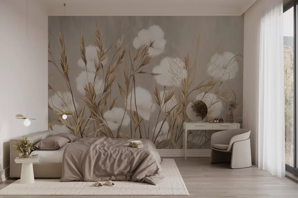Тапете за зид Меко, паперјасто памучно бело цвеће и висока трава наранџастог класја на пригушеној текстурираној беж позадини бр. w08784