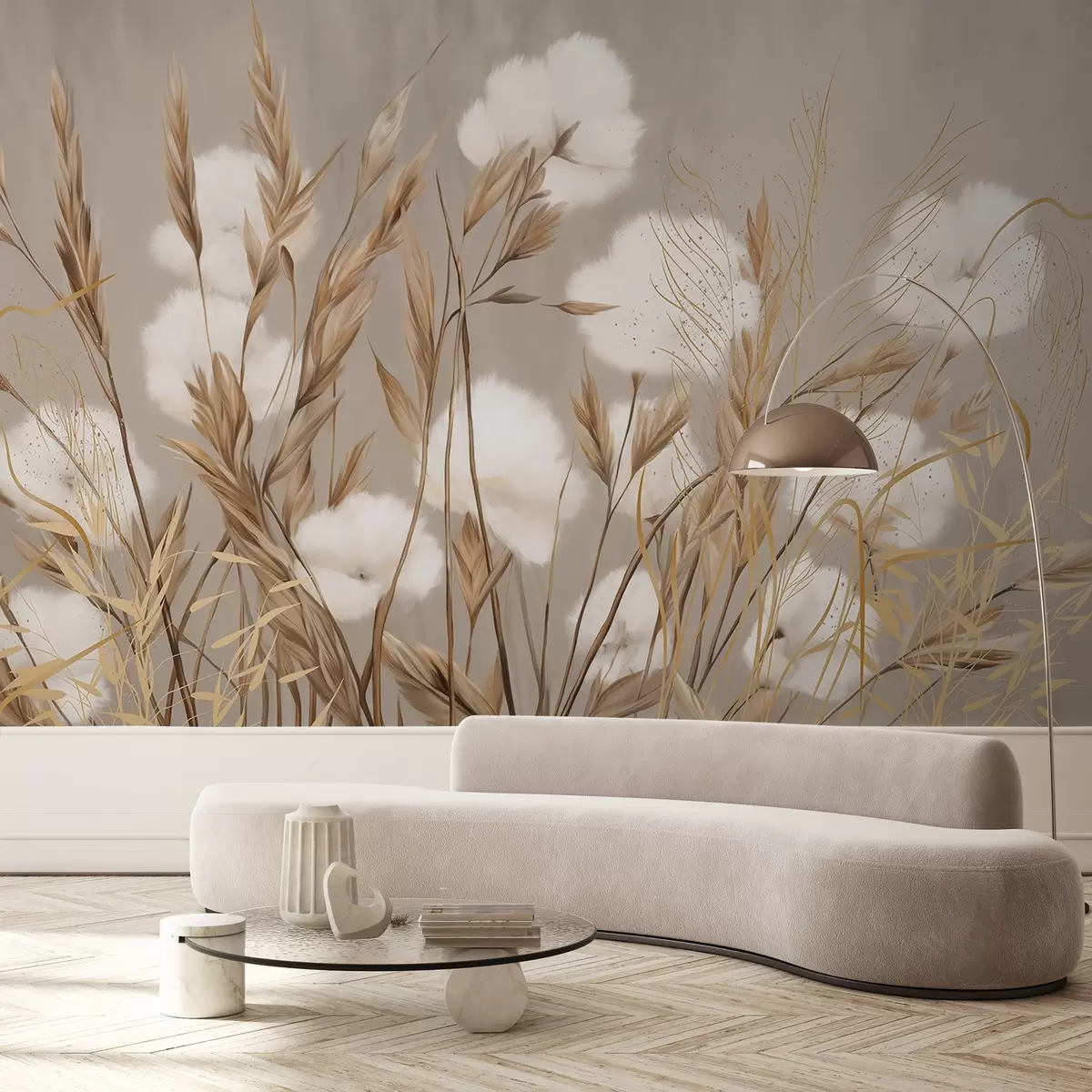 Тапете за зид Меко, паперјасто памучно бело цвеће и висока трава наранџастог класја на пригушеној текстурираној беж позадини бр. w08784