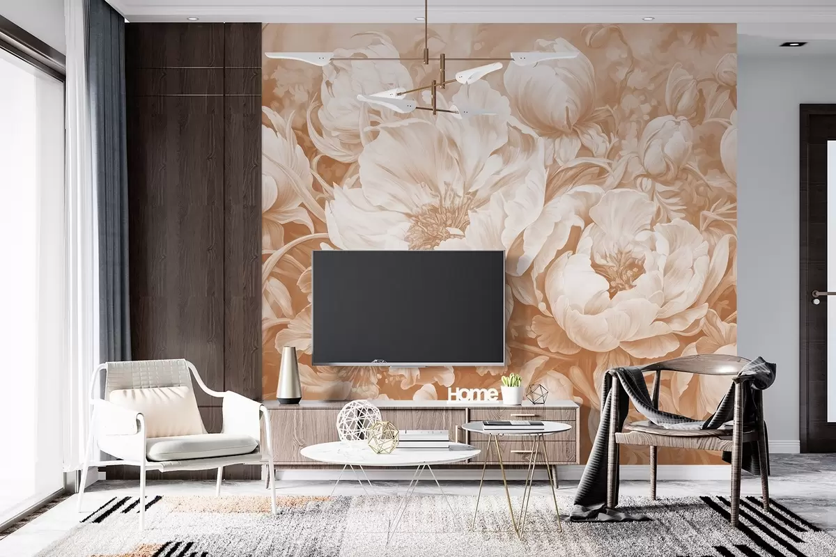 Тапете за зид Лале и божури, цветна композиција у стилу беж уљаног потеза бр. w08817v1