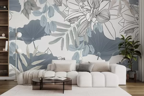 Тапете за зид Цветни принт са цветовима и листовима лотоса у плавој и белој боји на белој позадини бр. w08827