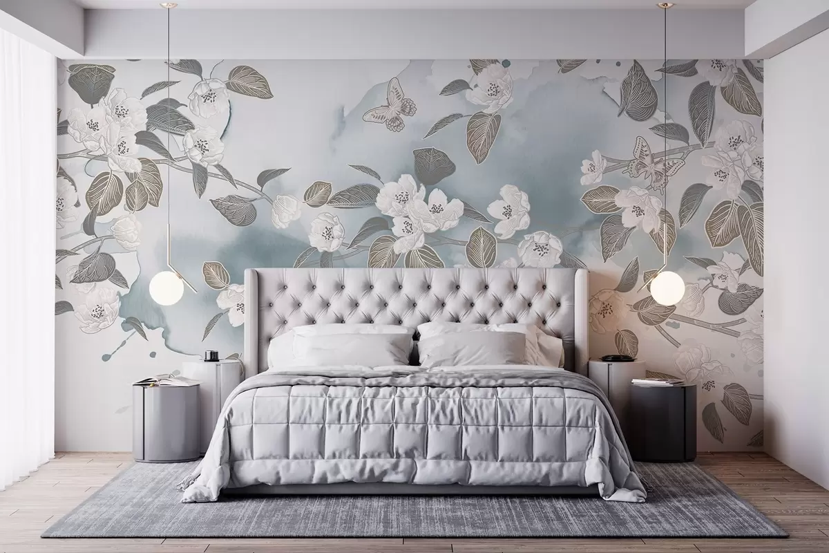 Тапете за зид Грана цвета трешње са цвећем, лишћем, лептирима на светло плавој акварел текстурираној позадини бр. w08831v1