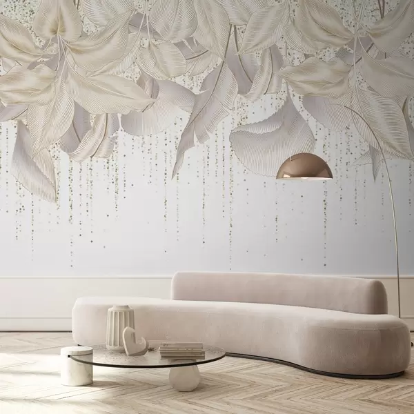 Тапете за зид Бели детаљни тропски листови и текстура жутих тачака на белој позадини бр. w08836