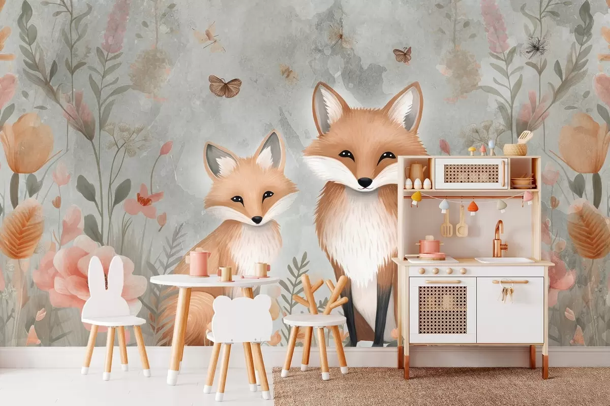Тапете за зид Две лисице у цвећу, имитација акварела бр. w08842
