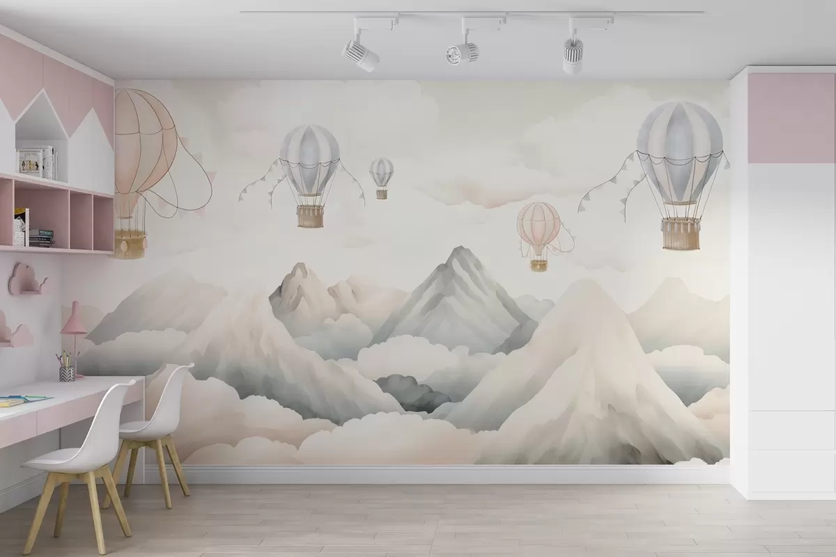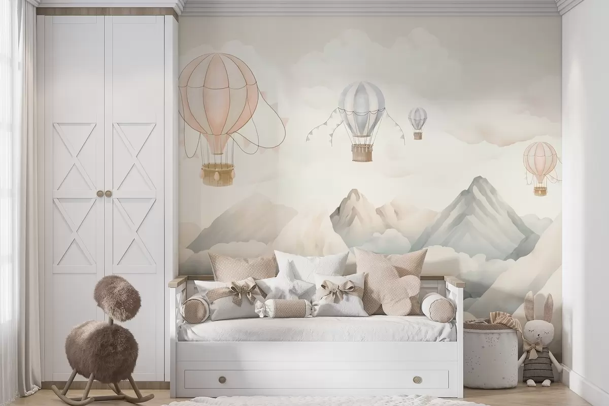 Тапете за зид Балони на врући ваздух који лебде изнад планина у неутралним, меким пастелним тоновима бр. w08853