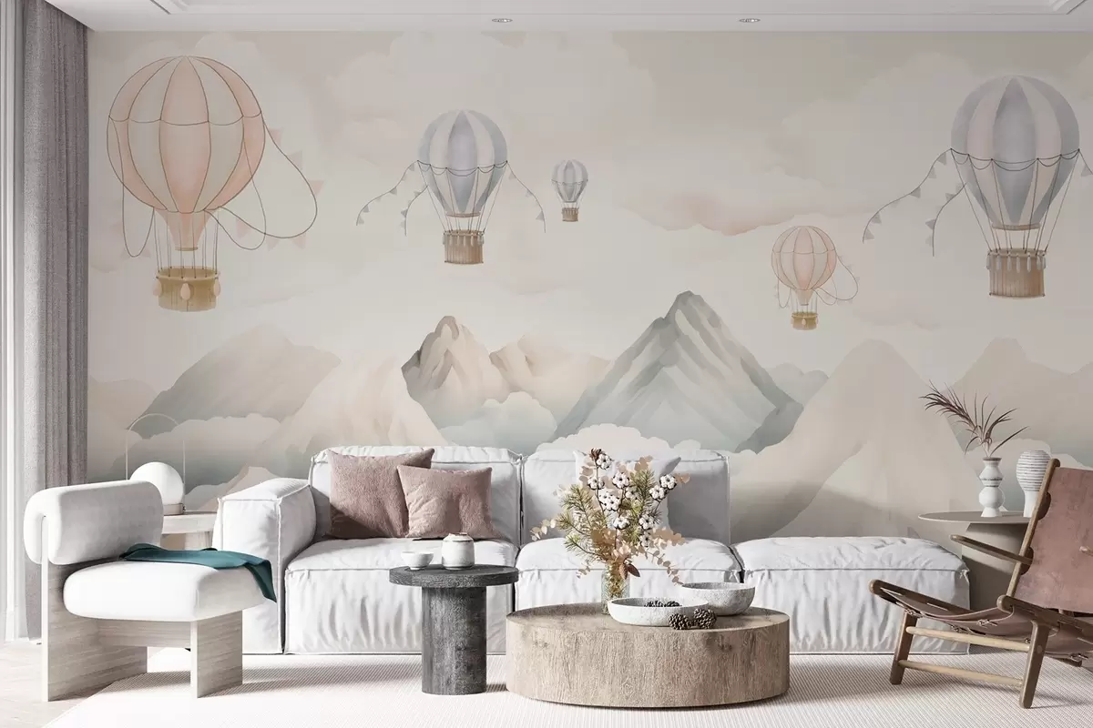 Тапете за зид Балони на врући ваздух који лебде изнад планина у неутралним, меким пастелним тоновима бр. w08853