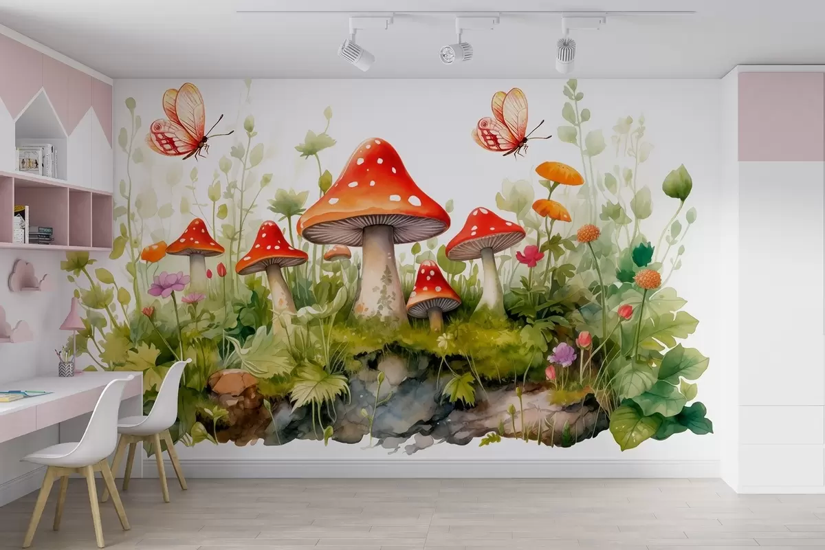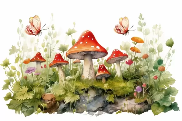 Тапете за зид Шумски пејзаж на белој позадини у стилу акварела са печуркама, жабама и лептирима бр. w08854