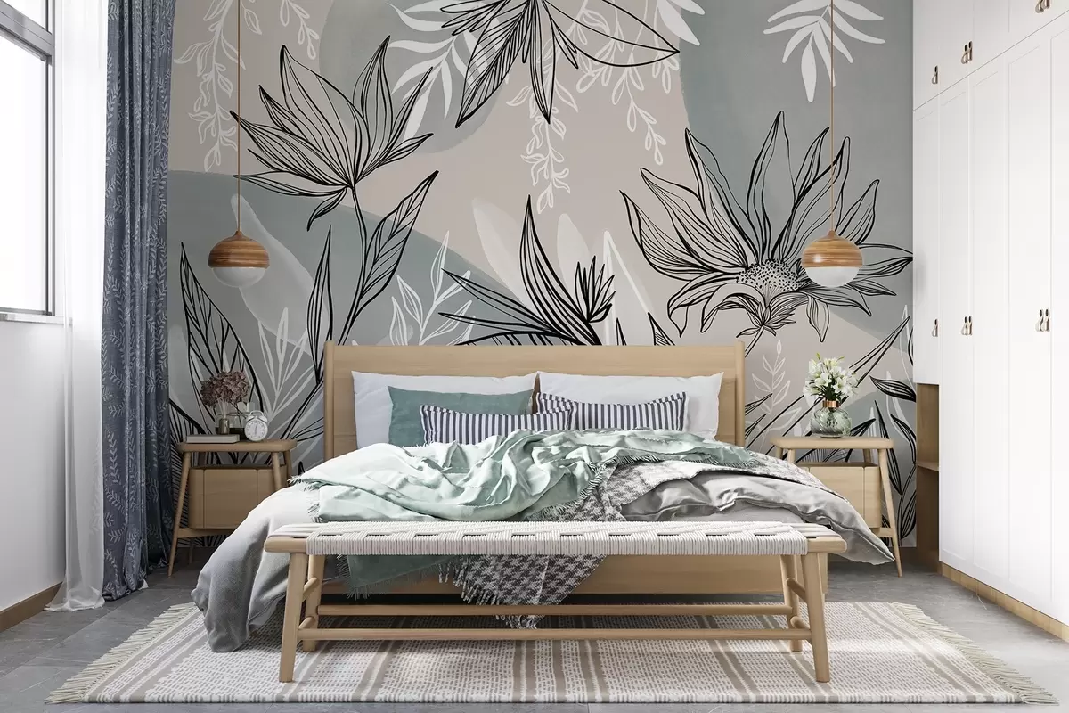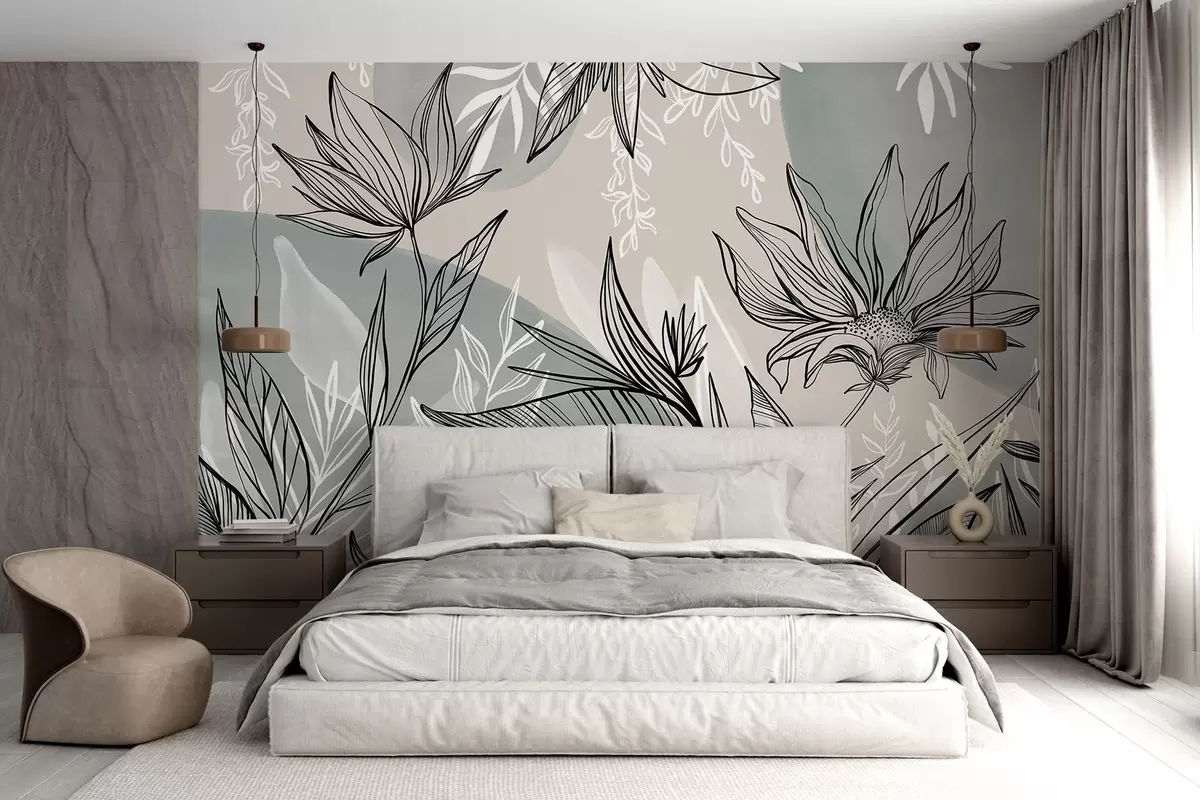 Тапете за зид Уметност цветних линија са великим листовима и цветовима, на позадини беж и плавих акварела бр. w08865
