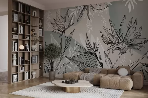 Тапете за зид Уметност цветних линија са великим листовима и цветовима, на позадини беж и плавих акварела бр. w08865