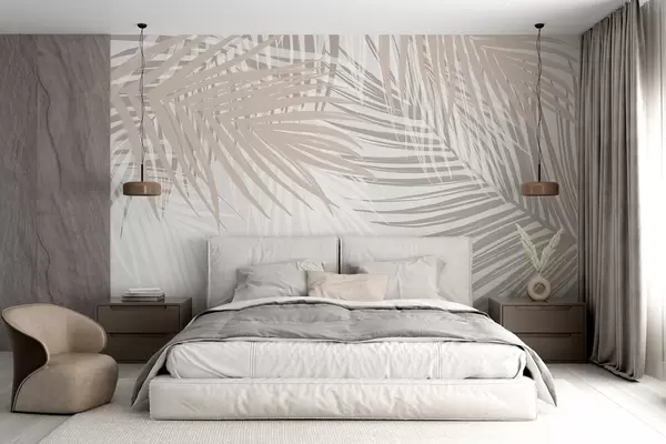 Тапете за зид Палмино лишће у светло беж и белим тоновима, тропско лишће, нежне пастелне боје, минималистички дизајн бр. w08869