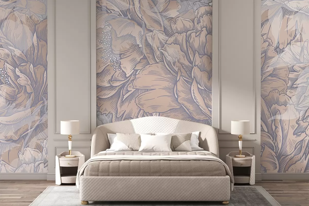 Тапете за зид Цвеће божура са детаљним латицама и прашницима, нежне пастелне боје, старински ботанички стил илустрације бр. w08890